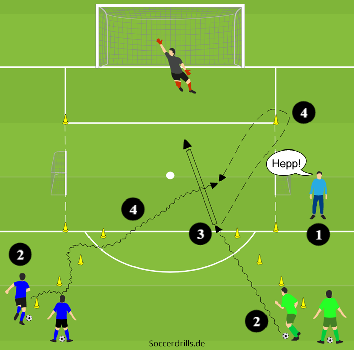- Nach dem Torschuss umläuft Grün das obere rechte Hütchen und wird zum Verteidiger. Spieler Blau dribbelt zum Minitor auf die andere Seite und sucht den Torerfolg.