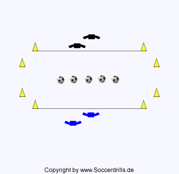 Markiere drei Linien, die parallel verlaufen und deren Abstand zueinander gleich ist. Die mittlere Linie wird mit fünf Bällen dargestellt. An jeder anderen Linie befinden sich zwei Spieler, die jeweils ein Team bilden. Auf Trainerkommando geht es los: der erste Spieler startet zu den Bällen und holt einen Ball dribbelnd, nach durchdribbeln eines seitlichen Tores, hinter die Linie zurück. Im Moment der Tordurchquerung startet sein Teampartner zum nächsten Ball. Jetzt geht es nur noch um einen Ball, der im Zweikampf erobert werden muss, wenn nicht ein Team richtig schnell ist.