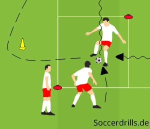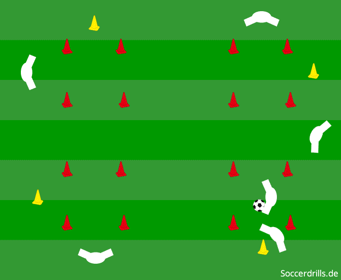 - Er stoppt den Ball mit der Sohle (der Ball ruht) und läuft ums gelbe Hütchen. Der Spieler in der Ecke startet und nimmt den Ball mit.