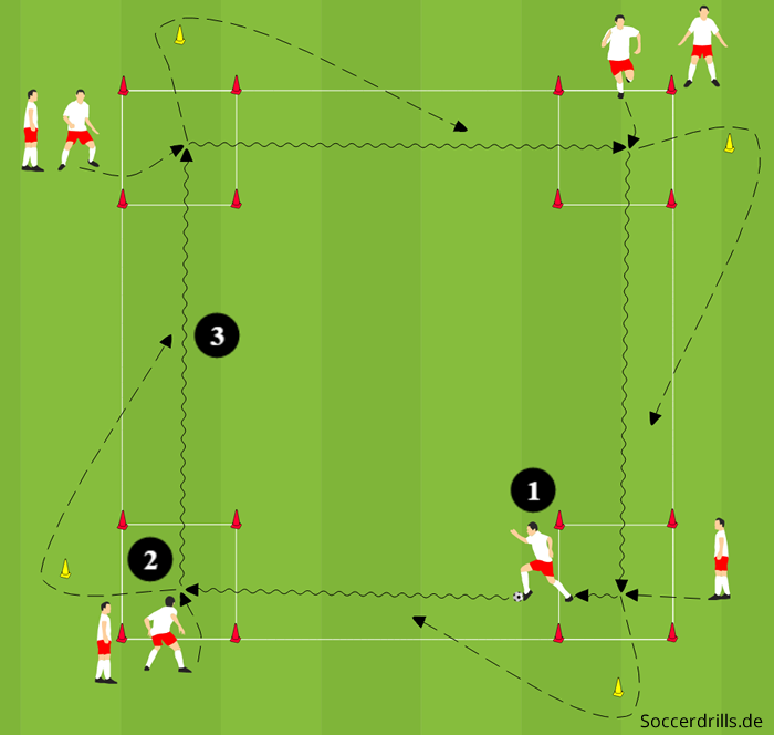 - Kleine Technikübung: Der erste Spieler dribbelt ins nächste Quadrat und stoppt dort den Ball, Der nächste Spieler passt ein Quadrat weiter, von dort wird wieder gedribbelt, usw.