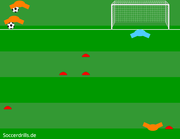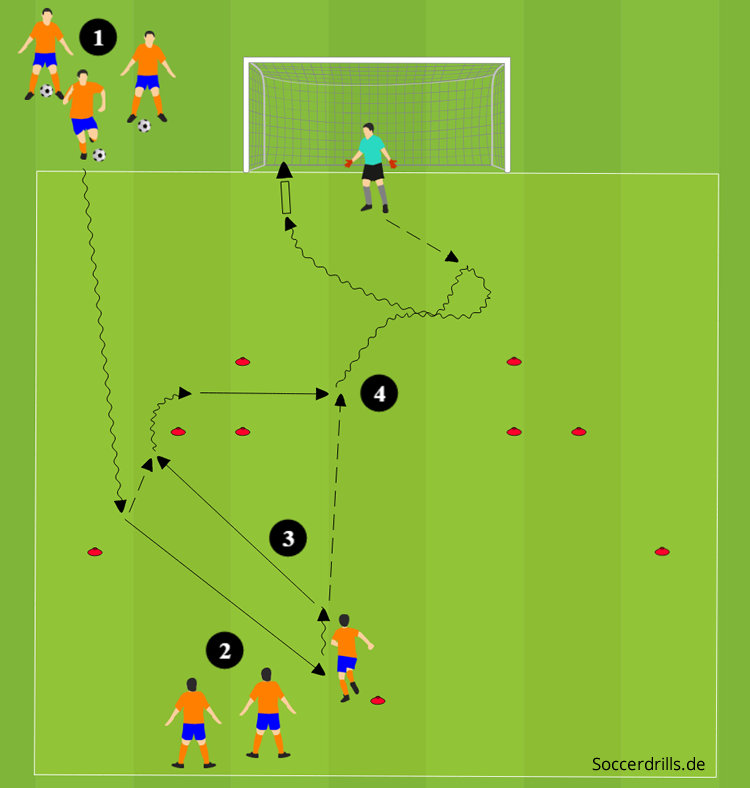- Zwischenzeitlich ist der erste Passempfänger zum Tor gestartet, kontrolliert den Ball, geht ins Dribbling und spielt den Torwart im 1 gegen 1 aus.