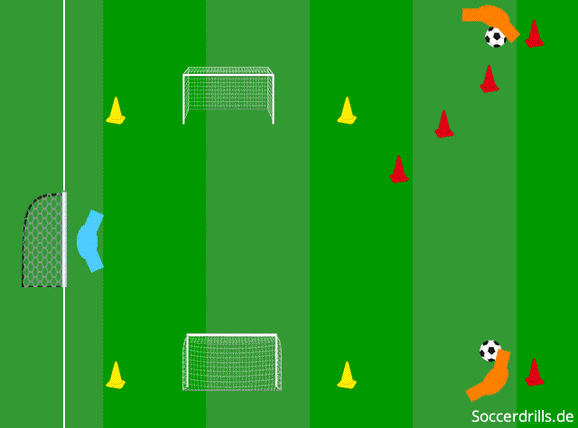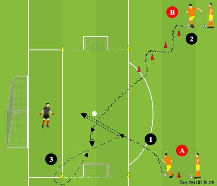 - Nach dem Torschuss greift der Torwart ins Spiel ein. Er wird der Mitspieler von B, es kommt zum 2 gegen 1.