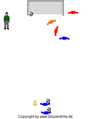 Neben dem Tor steht ein Verteidiger. Der Startspieler dribbelt zum Torschuss. Kommt vom Trainer das Kommando "Duell" greift der Verteidiger sofort den Ballbesitzer an. Kommt dieser Ruf nicht, wird auch nicht gestört. Verteidiger und Angreifer tauschen anschließend die Gruppen.