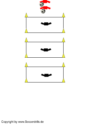 Das Übungsfeld besteht aus drei markierten Rechtecken (Linien, wie in der Animation, sind nicht unbedingt erforderlich). Der erste Spieler der Gruppe (rot) versucht, die Verteidiger in den drei Feldern der Reihe nach auszuspielen. Die Felder zwischen den Rechtecken sind Erholungszonen für den Dribbler und dürfen von den Verteidigern nicht betreten werden. Bleibt der Dribbler an einem Verteidiger hängen, verlässt er sofort das Spielfeld ohne zu stören. Nach einigen Durchgängen zum Eingewöhnen startet das Dribbling auf Kommando des Trainers. Dadurch werden die Abstände kürzer und die Abwehrarbeit erschwert.