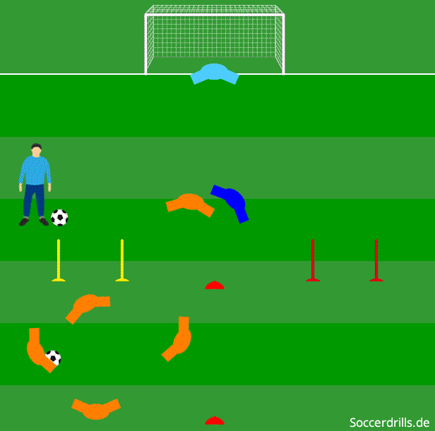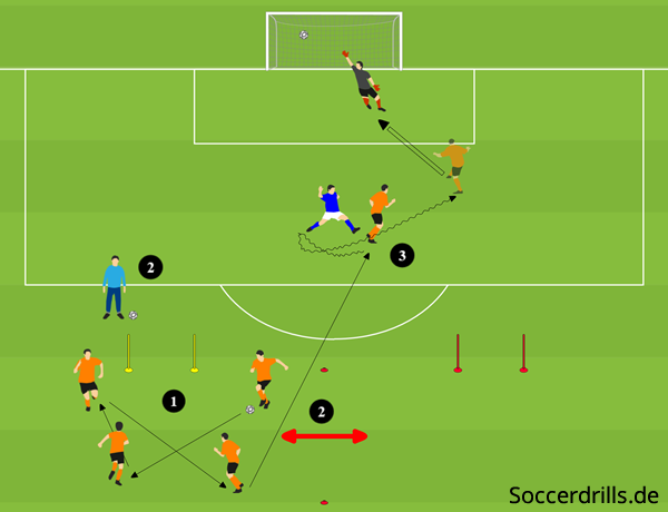 Der Übungsablauf bietet nicht nur das Trainieren im Zweikampf mit dem Gegner im Rücken. Durch die Passgruppe kommt intensives Passtraining hinzu. Exaktes Direktspiel (One Touch) und vor dem Torerfolg ein Zweikampf, zwei wichtige Lehrinhalte in einer Trainingsübung.