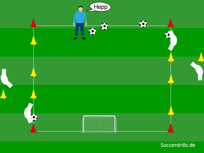 - Spieler A nimmt den Ball ins Dribbling mit und versucht ein Tor zu erzielen, Spieler B startet ins Feld und wird zum Verteidiger. Der Trainer legt vorher den Spielball bereit, entsprechend liegen bei ihm mehrere Bälle für weitere Aktionen. Nach ca. 15 Sekunden wird der Zweikampf abgebrochen.