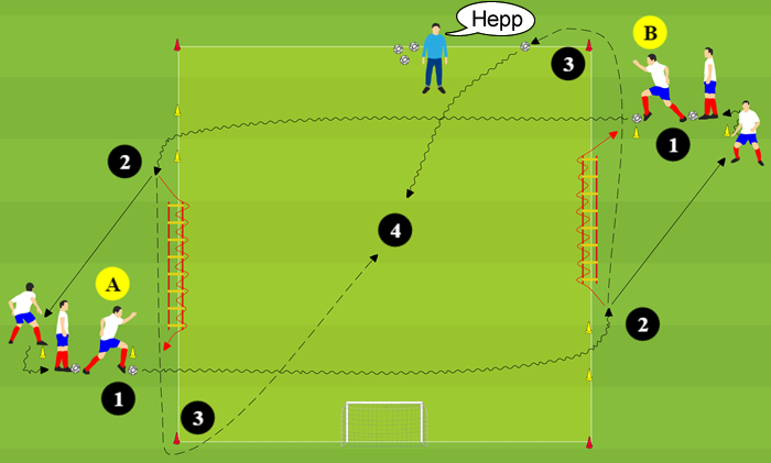 - A und B folgen dem Pass, aber sprinten direkt zum Feldbegrenzungs-Hütchen und umkurven dies. Alternativ werden auf der Strecke koordinative Zusatzaufgaben ausgeführt.
