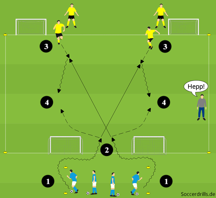 - Dort starten die Spieler aus den gelben Teams den Pässen entgegen und verarbeiten die Bälle so, dass sie sofort in Richtung Minitor auf die andere Seite dribbeln. Sie suchen den schnellen Torerfolg.