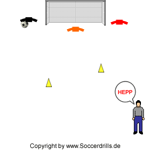 Material: Pro Angreifer 1 Ball, 2 Hütchen oder Markierungen, 1 Tor.
