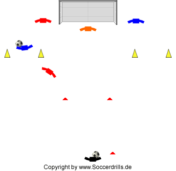 Jeweils die ersten beiden Spieler der Gruppen, die links und rechts neben dem Tor postiert werden, starten zum markierten Passempfang. Der Spieler, der zuerst dort ankommt erhält den Ball und versucht sofort in Richtung Tor zu ziehen. Der zweite Spieler soll den Weg zum Tor zu blockieren. Gelingt der Durchbruch zum Tor nicht, versucht der Angreifer auf die Flügel auszuweichen, um dort zwischen zwei Markierungen hindurch zu dribbeln.