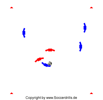 In unserer Animation beginnen wir mit einem 4 gegen 1, aber jede andere Anzahl von Spielern ist möglich. Beginne immer mit einem Verteidiger! Nun gibt es zwei Möglichkeiten: die Anzahl der Pässe, oder eine vorgegebene Zeit. Erreichen die Passspieler das Pass- oder Zeitziel, kommt immer wieder ein Verteidiger hinzu. Schaffen es die Verteidiger das Passspiel zu unterbrechen, wird die ballbesitzende Mannschaft komplett ausgetauscht. Wer schafft es das Ziel zu erreichen bei gleicher Anzahl von Verteidigern?